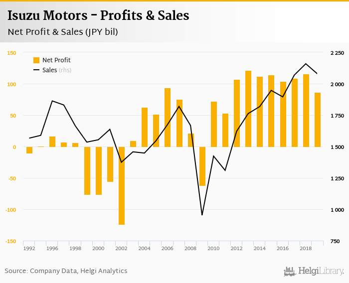 Isuzu Motors made a net profit of JPY 86.9 bil in 2019, down 25% compared to the previous year. Total sales reached JPY 2,079 bil, which is down 3.7% when compared to the previous year.