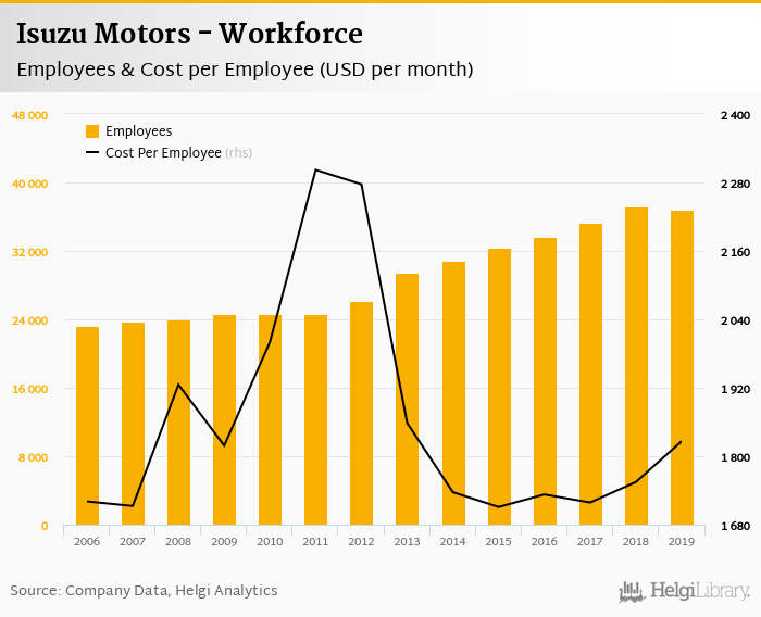 Isuzu Motors employed 36,856 employees in 2019, down 1.09% compared to the previous year. Historically, between 1999 and 2019, the firm's workforce hit a high of 37,263 employees in 2018 and a low of 18,130 employees in 2003.