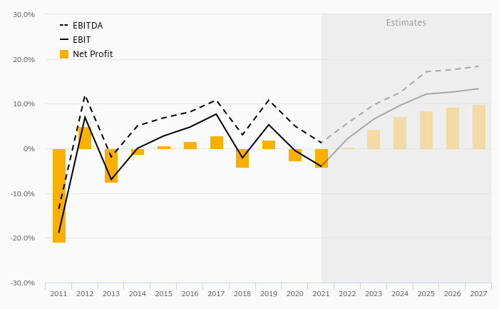 In terms of EV/EBITDA, stock traded at 135x at the end of 2021. Since 2016, stock has traded between 14.7x and 135x with an average of 49.6x.
