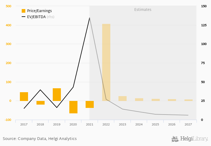 At the end of 2021, the firm traded at price to earnings of -36.0x. Over the last five years, this multiple achieved a high of 68.2x in 2019 and a low of -65.2x in 2020 with an average of -0.962x.