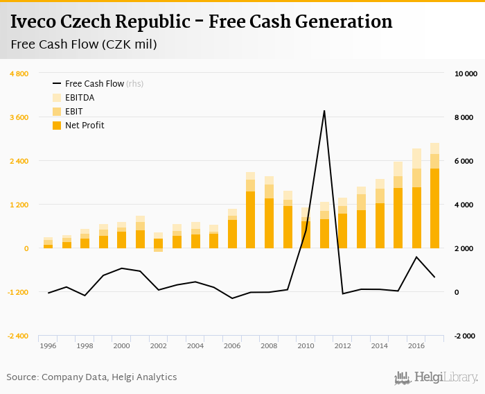 Iveco Czech Republic made a net profit of CZK 2,185 mil with revenues of CZK 21,696 mil in 2017, up by 30.3% and up by 25.9%, respectively, compared to the previous year. This translates into a net margin of 10.1%.
