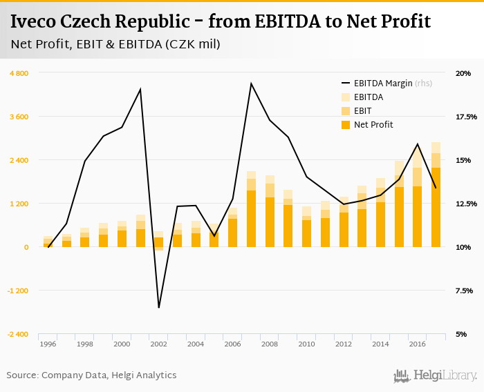 Iveco Czech Republic made a net profit of CZK 2,185 mil with revenues of CZK 21,696 mil in 2017, up by 30.3% and up by 25.9%, respectively, compared to the previous year. This translates into a net margin of 10.1%.