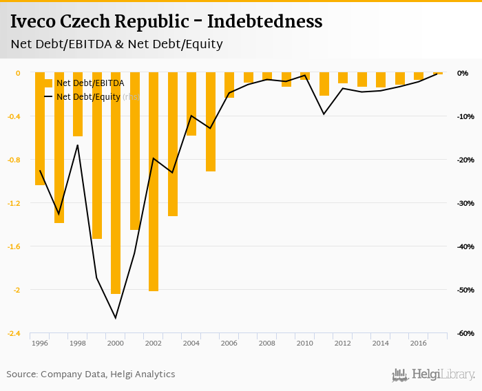 Iveco Czech Republic's net debt stood at CZK -33.7 mil and accounted for -0.364% of equity at the end of 2017. The ratio is up 1.83 pp compared to the previous year.