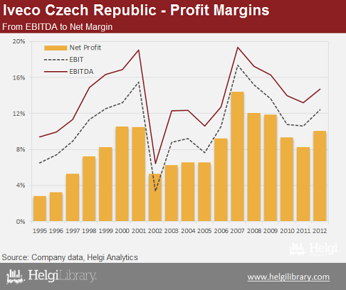 The Company doubled its sales in the last decade, to nearly CZK 9.5 bil in 2012. It operates with an impressive net margin of 10% and virtually without any debt