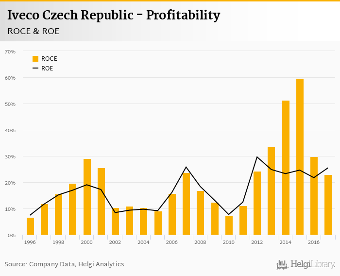 As far as Iveco Czech Republic's peers are concerned, Tatra Trucks generated ROE of 22.6% and ROCE of 12.7% in 2017. MAN SE's profitability reached 5.19% and 1.87%, respectively. Scania Group operated with 18.9% and 6.11% returns in 2017.