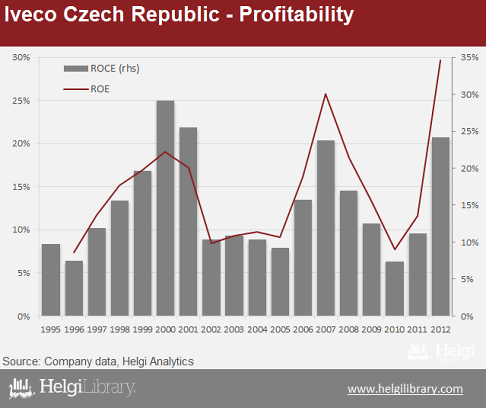 The Company doubled its sales in the last decade, to nearly CZK 9.5 bil in 2012. It operates with an impressive net margin of 10% and virtually without any debt