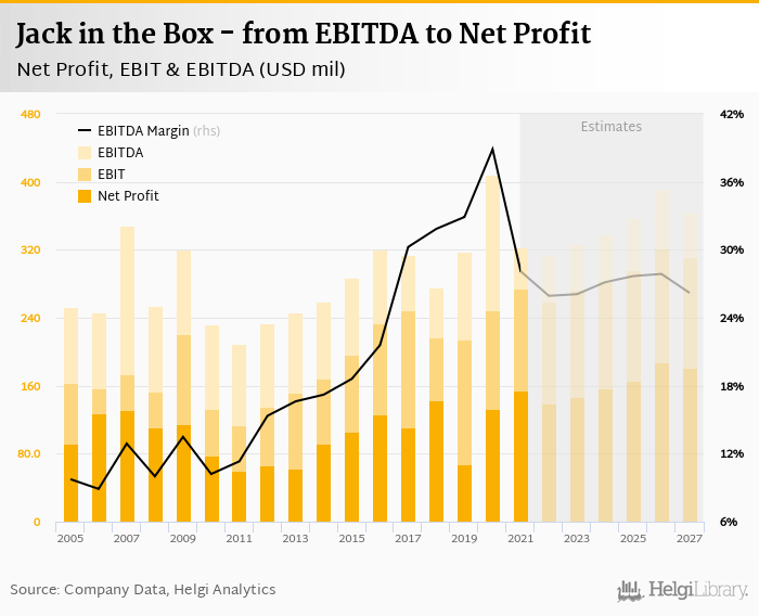 Jack in the Box made a net profit of USD 154 mil with revenues of USD 1,150 mil in 2021, up by 16.2% and up by 9.26%, respectively, compared to the previous year. This translates into a net margin of 13.4%.