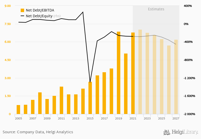 Historically, the firm’s net debt to equity reached a high of 259% in 2014 and a low of -1,296% in 2015 between 2005 and 2021. The average for the last five years was -256%.