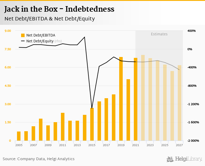 Jack in the Box's net debt stood at USD 2,198 mil and accounted for -280% of equity at the end of 2021. The ratio is down 4.38 pp compared to the previous year.