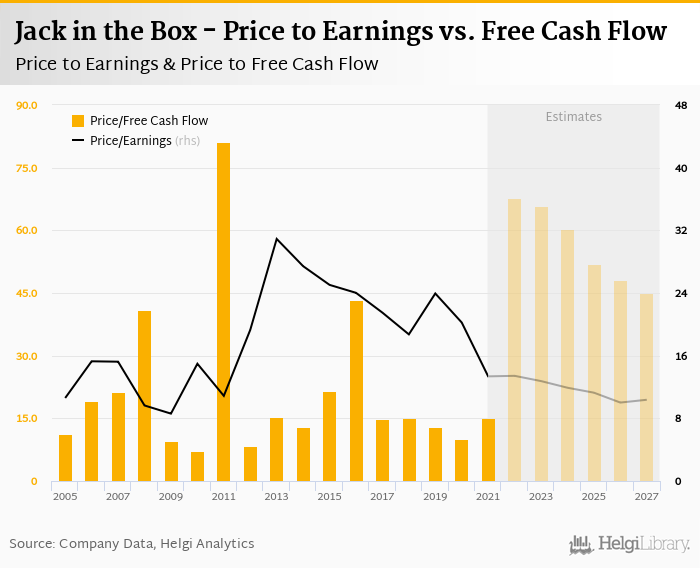 Regarding cash generated defined by the sum of net profit and depreciation, the stock traded at x at the end of 2021. When investments are excluded to get free cash flow, Jack in the Box traded at 15.2x.