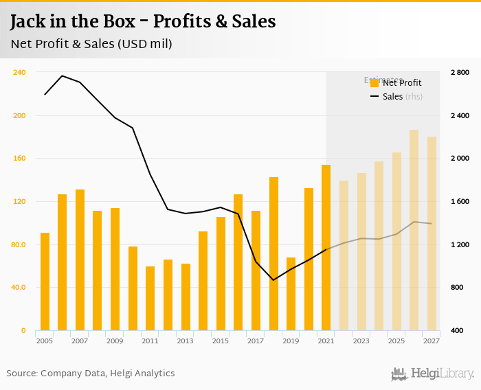 Jack in the Box made a net profit of USD 154 mil in 2021, up 16.2% compared to the previous year. Total sales reached USD 1,150 mil, which is up 9.26% when compared to the previous year.