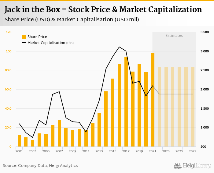 Jack in the Box stock traded at USD 98.4 per share at the end 2021 implying a market capitalization of USD 2,091 mil.