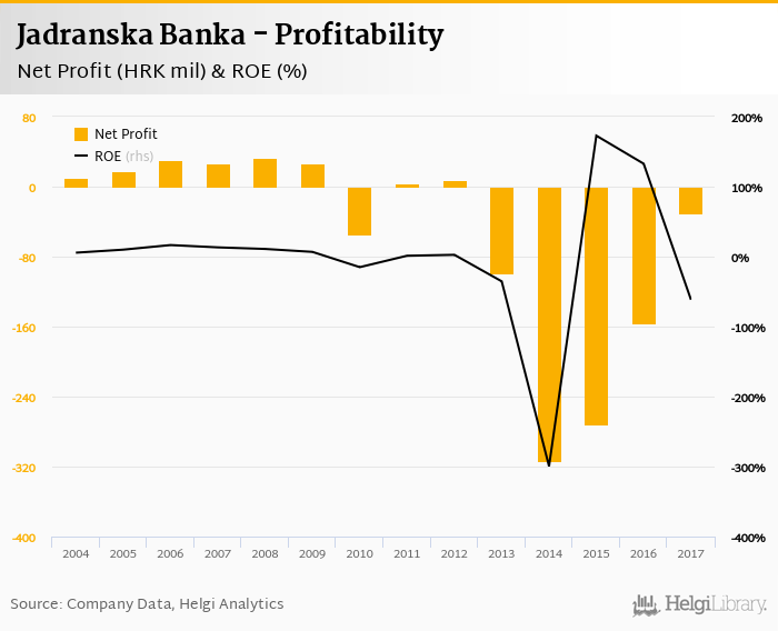 Jadranska Banka made a net profit of HRK -31.0 mil in 2017, up 80.1% compared to the previous year. This implies a return on equity of -61.6%.