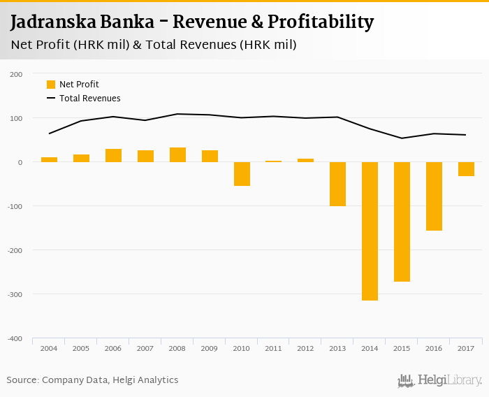 Jadranska Banka made a net profit of HRK -31.0 mil under revenues of HRK 60.4 mil in 2017, up 80.1% and -4.24% respectively compared to the previous year.