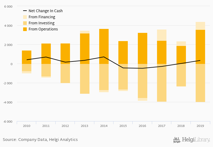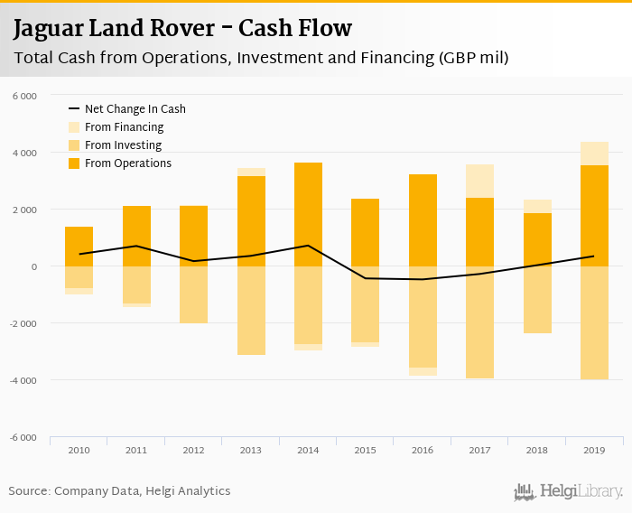 Jaguar Land Rover's operating cash flow stood at GBP 3,546 mil in 2019, up 88.4% when compared to the previous year. Historically, between 2010 - 2019, the firm’s operating cash flow reached a high of GBP 3,656 mil in 2014 and a low of GBP 1,390 mil in 2010.