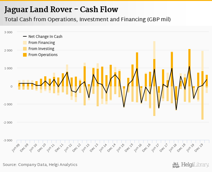 Jaguar Land Rover's operating cash flow stood at GBP 636 mil in 1Q2020, down 69% when compared to the previous year. Historically, between 2Q2009 - 1Q2020, the firm’s operating cash flow reached a high of GBP 2,054 mil in 1Q2019 and a low of GBP -758 mil in 2Q2018.