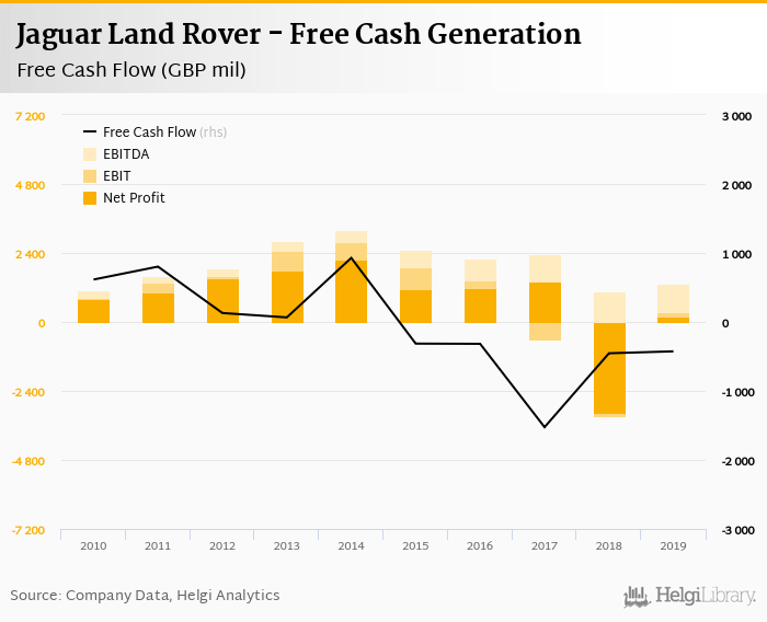 Jaguar Land Rover made a net profit of GBP 187 mil with revenues of GBP 24,692 mil in 2019, up by 106% and up by 0.231%, respectively, compared to the previous year. This translates into a net margin of 0.757%.