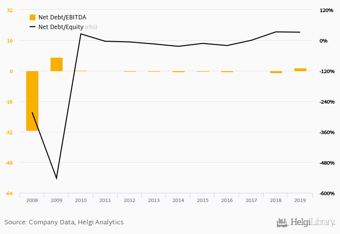 Historically, the firm’s net debt to equity reached a high of 32.7% in 2018 and a low of -542% in 2009 between 2008 and 2019. The average for the last five years was 6.09%.