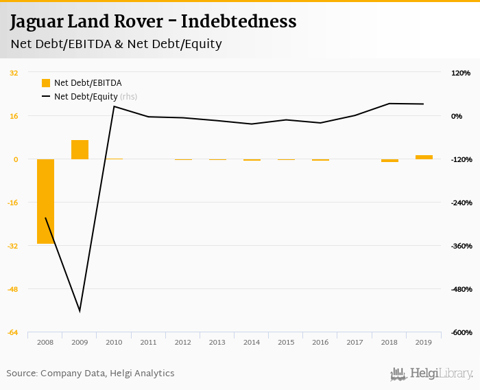 Jaguar Land Rover's net debt stood at GBP 1,994 mil and accounted for 31.5% of equity at the end of 2019. The ratio is down 1.23 pp compared to the previous year.
