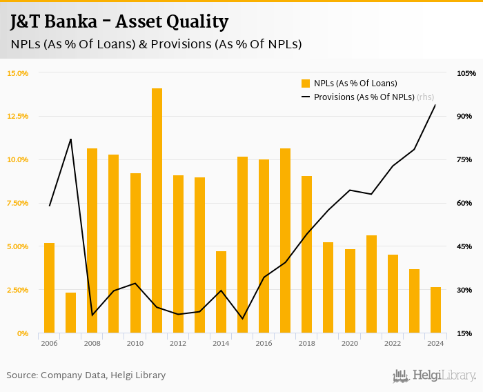 Comparing J&T Banka with its closest peers, Ceska Sporitelna operated at the end of 2024 with NPL ratio of 1.80% and provision coverage of 102%, CSOB with 1.43% and 43.6% respectively and Komercni Banka had 1.94% of bad loans covered with 44.3% by provisions at the end of 2024.