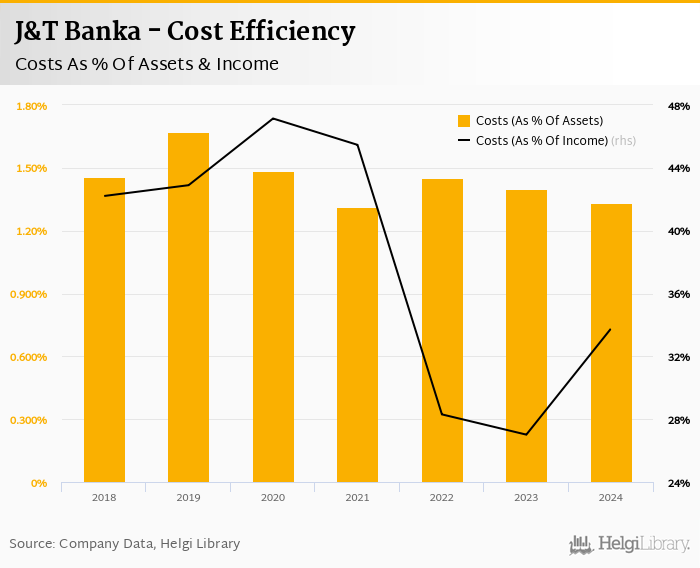 J&T Banka's cost to income ratio reached 33.8% in 2024, up from 27.0% compared to the previous year.