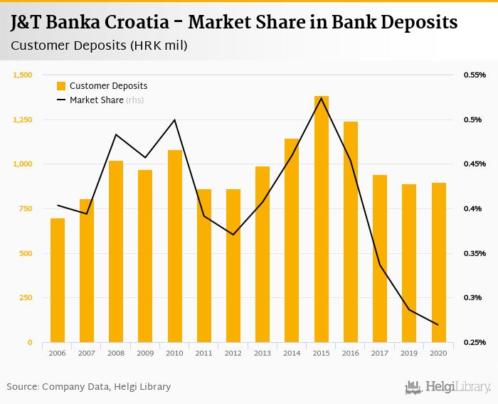 J&T Banka Croatia accounted for 0.269% of all customer deposits taken by banks in Croatia at the end of 2020. Historically, the bank’s market share in customer deposits reached an all time high of 0.523% in 2015 and an all time low of 0.269% in 2020.
