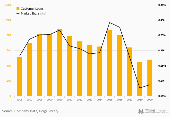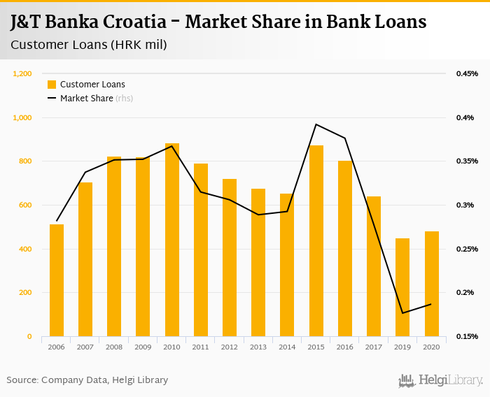 J&T Banka Croatia accounted for 0.187% of all customer loans issued in Croatia at the end of 2020. Historically, the bank’s market share in customer loans reached an all time high of 0.392% in 2015 and an all time low of 0.176% in 2019.