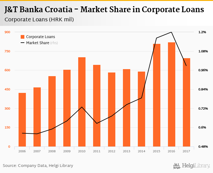 J&T Banka Croatia's corporate loans reached HRK 696 mil in 2017, down 15.3% compared to the previous year.