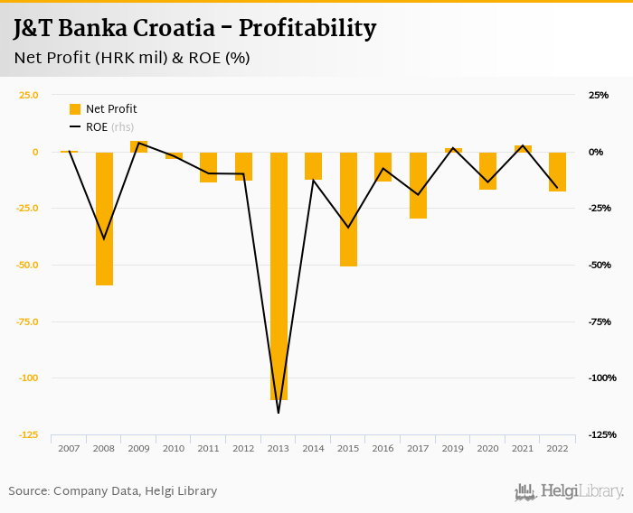 J&T Banka Croatia made a net profit of HRK -17.4 mil in 2022, down 684% compared to the previous year. This implies a return on equity of -16.3%.