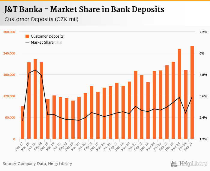 J&T Banka's customer deposits reached CZK 261,261 mil in 3Q2024, up 35.6% compared to the previous year.