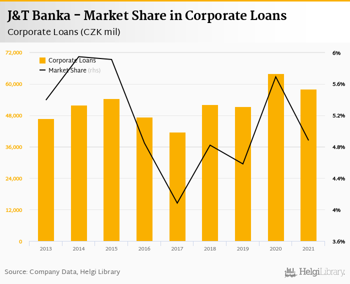 J&T Banka's corporate loans reached CZK 58,126 mil in 2021, down 9.04% compared to the previous year.