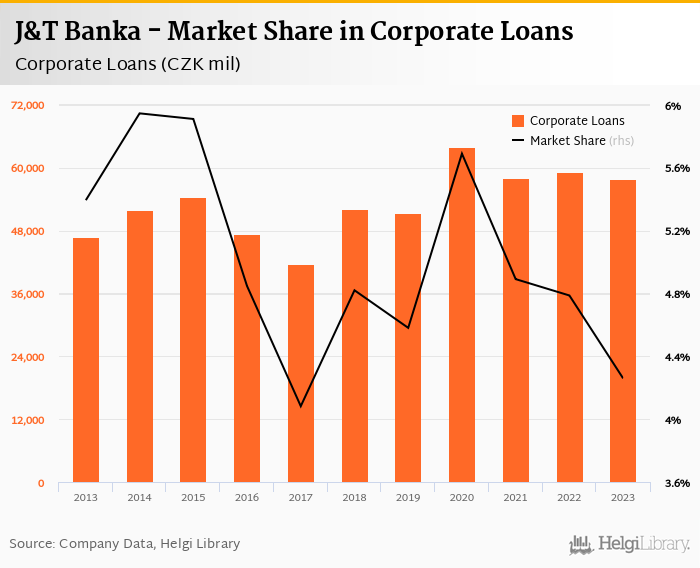 J&T Banka's corporate loans reached CZK 57,851 mil in 2023, down 2.32% compared to the previous year.