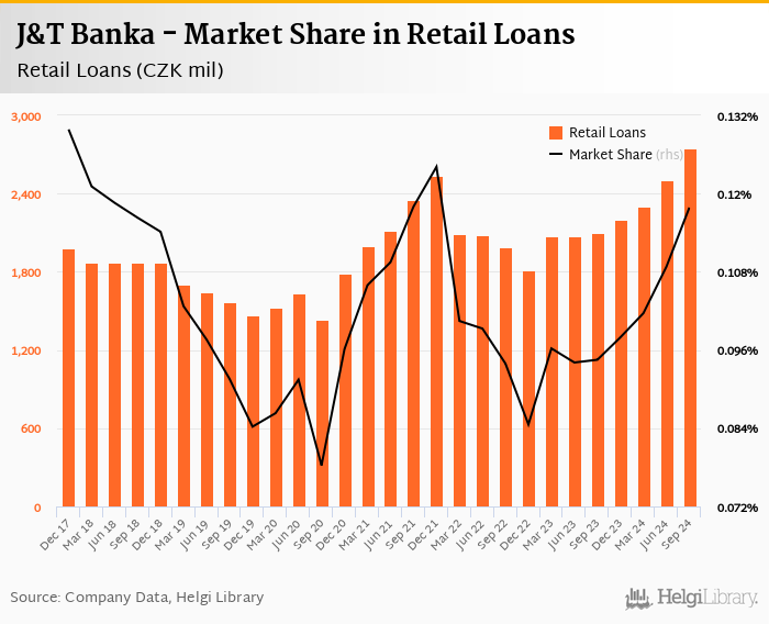 J&T Banka accounted for 0.118% of all retail loans issued in Czechia at the end of 3Q2024. Historically, the bank’s market share in retail loans reached an all time high of 0.130% in 4Q2017 and an all time low of 0.078% in 3Q2020.