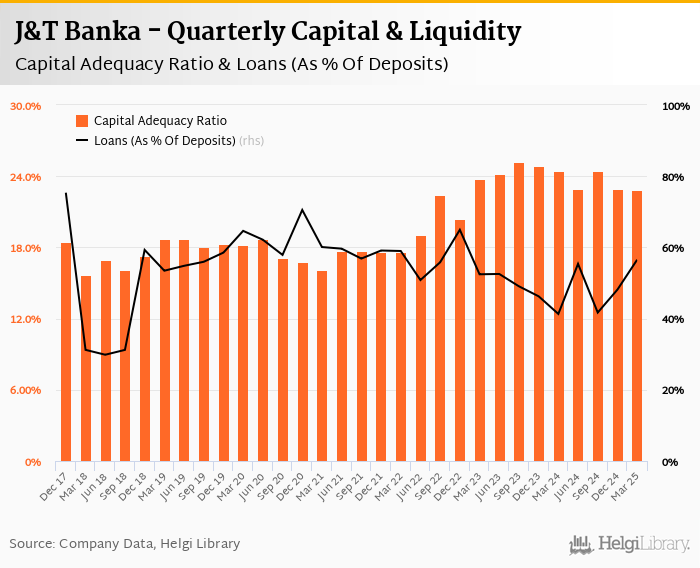J&T Banka's capital adequacy ratio reached 22.9% at the end of first quarter of 2025, down from 22.9% when compared to the previous quarter. Historically, the bank’s capital ratio hit an all time high of 25.2% in 3Q2023 and an all time low of 15.6% in 1Q2018.