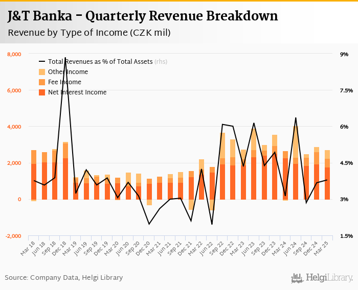 J&T Banka generated total banking revenues of CZK 2,720 mil in the first quarter of 2025, up 4.61% when compared to the same period of last year and down 5.9% when compared to the previous quarter.