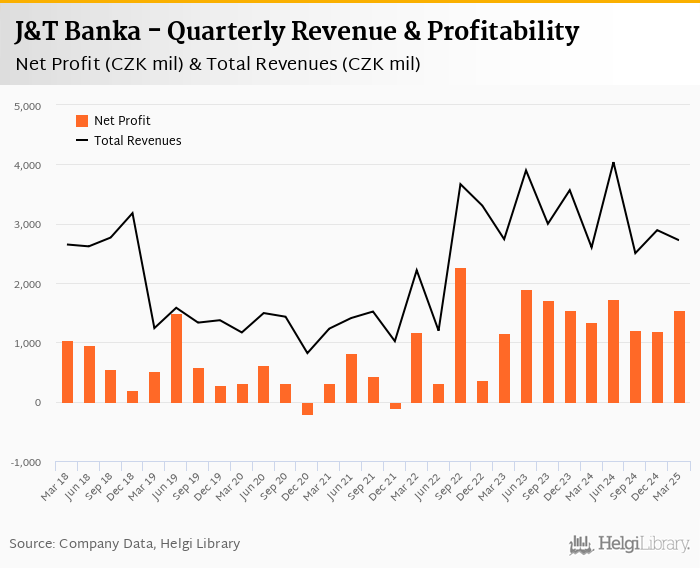 J&T Banka made a net profit of CZK 1,552 mil under revenues of CZK 2,720 mil in the first quarter of 2025, up 15.8% and 4.61% respectively when compared to the same period last year.