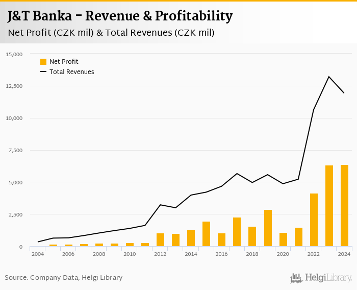 J&T Banka made a net profit of CZK 6,352 mil under revenues of CZK 11,908 mil in 2024, up 0.490% and -9.79% respectively compared to the previous year.