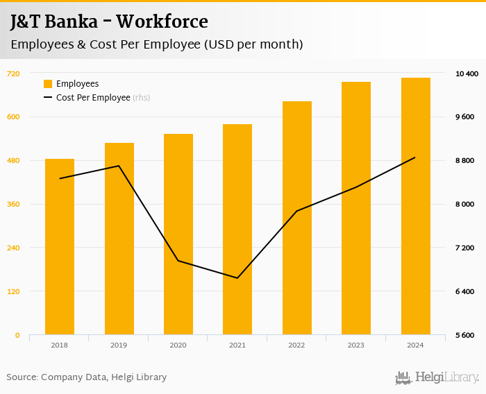 J&T Banka employed 709 persons in 2024, up 1.58% when compared to the previous year. Historically, the bank's workforce hit an all time high of 709 persons in 2024 and an all time low of 485 in 2018.