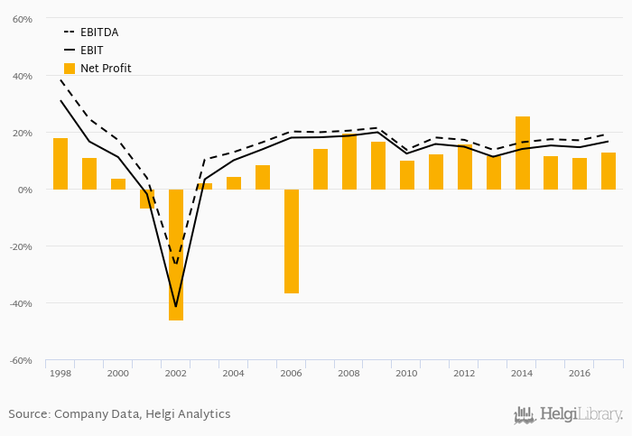 This translates into a net margin of 13.0%. Historically, between 1998 and 2017, the firm’s net margin reached a high of 25.6% in 2014 and a low of -46.0% in 2002. The average net margin in the last five years amounted to 14.6%.