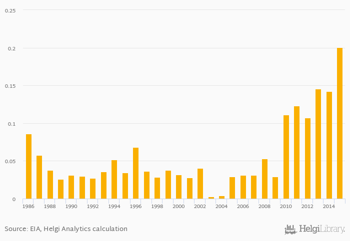 Jet fuel consumption as a share of worldwide consumption rose 40.9% to 0.200% in Trinidad and Tobago in 2015, according to EIA.