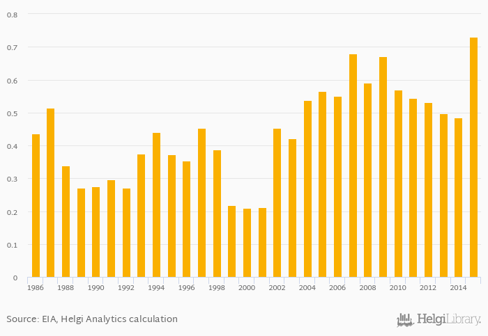 Jet fuel consumption as a share of worldwide consumption rose 50.4% to 0.730% in Egypt in 2015, according to EIA.