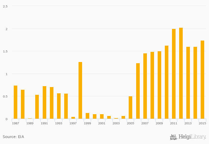 Jet fuel consumption rose 8.63% to 1.74 '000 bpd in Uruguay in 2015, according to EIA.