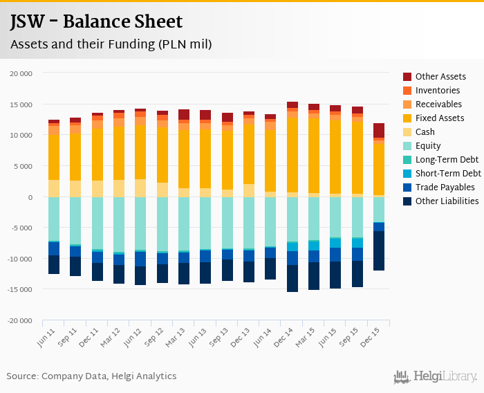 JSW's total assets reached PLN 11,971 mil at the end of 4Q2015, down 22.1% compared to the previous year.