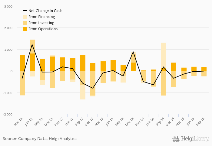Cash from financing amounted to PLN -11.4 mil, so the company generated PLN -50.5 mil net cash in 3Q2015.
