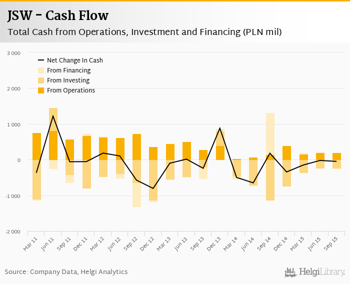 JSW's operating cash flow stood at PLN 193 mil in 3Q2015, up 35.4% when compared to the previous year. Historically, between 1Q2011 - 3Q2015, the firm’s operating cash flow reached a high of PLN 822 mil in 2Q2011 and a low of PLN 37.7 mil in 1Q2014.