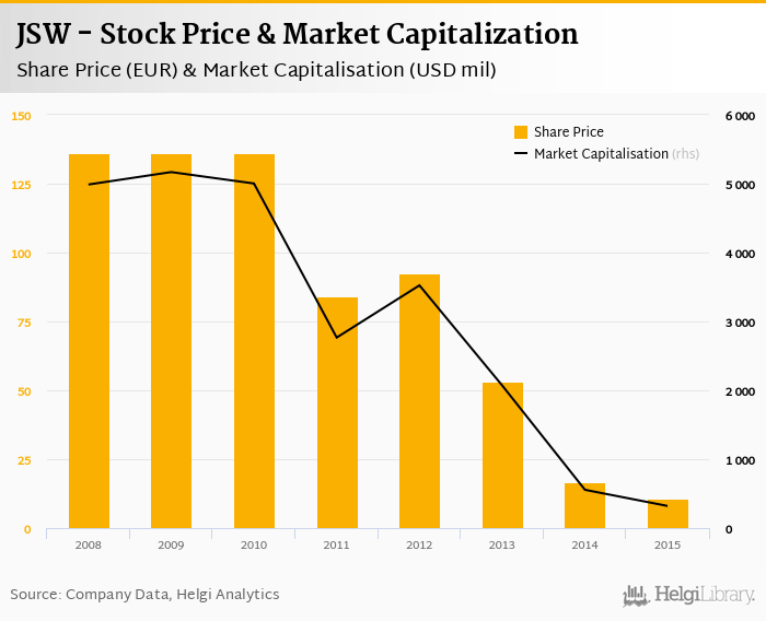 JSW stock traded at EUR 10.7 per share at the end 2015 implying a market capitalization of USD 321 mil.