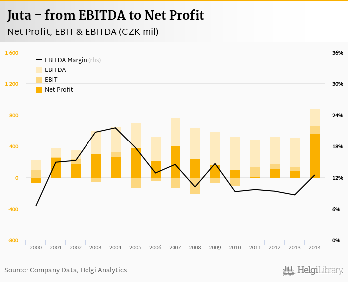 Juta made a net profit of CZK 560 mil with revenues of CZK 7,095 mil in 2014, up by 531% and up by 21.1%, respectively, compared to the previous year. This translates into a net margin of 7.90%.