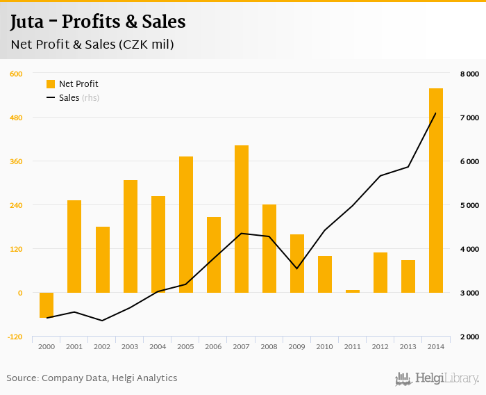 Juta made a net profit of CZK 560 mil in 2014, up 531% compared to the previous year. Total sales reached CZK 7,095 mil, which is up 21.1% when compared to the previous year.