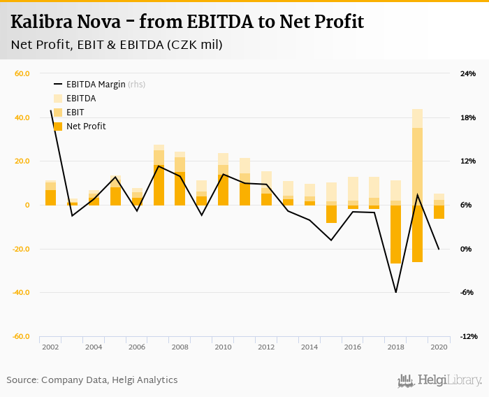 Kalibra Nova made a net profit of CZK -5.94 mil with revenues of CZK 255 mil in 2020, up by 77% and up by 2.26%, respectively, compared to the previous year. This translates into a net margin of -2.33%.