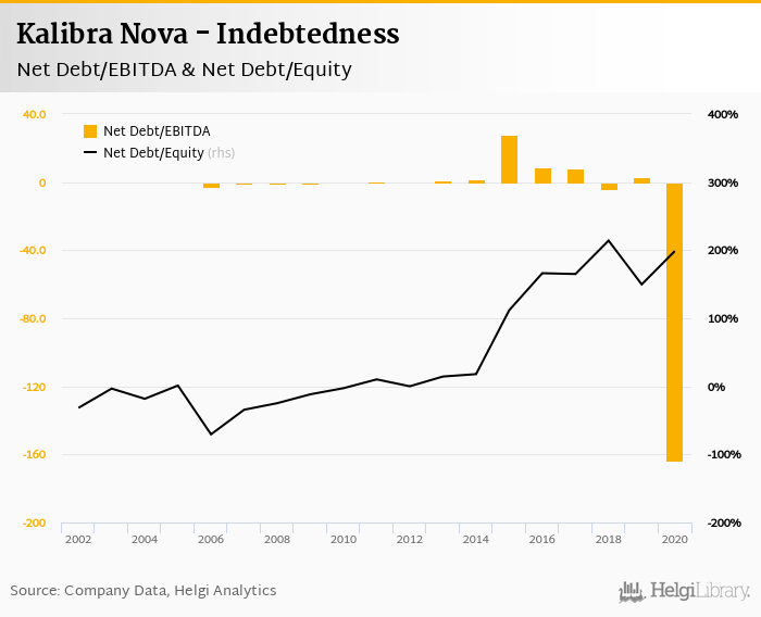 Kalibra Nova's net debt stood at CZK 63.1 mil and accounted for 199% of equity at the end of 2020. The ratio is up 49.0 pp compared to the previous year.